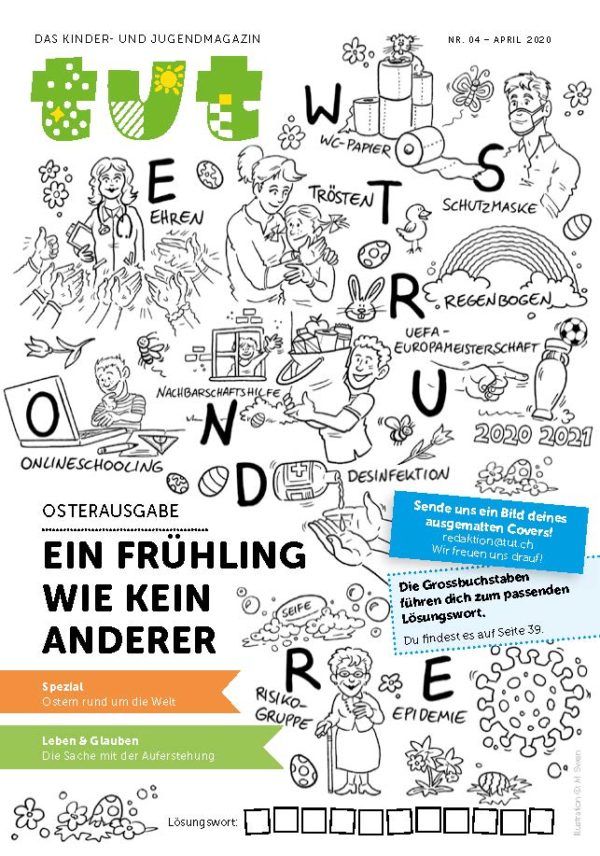 Seit drei Wochen sind die Schulen in der Schweiz geschlossen. Auch für Nina aus Murten (FR). Die 11-Jährige erzählt, wie sie damit umgeht und warum sie keine Angst vor dem Corona-Virus hat. Ausserdem: von Menschen und Hamstern, ein Comic über Homeschooling und warum Lachen in schwierigen Situationen helfen kann. Die Ausgabe hält zudem allerhand Wissenswertes über Ostern bereit: Warum wir das Fest feiern und was es mit Pessach, Osterlamm, Osterkerze und Osterfeuer auf sich hat. Mit Ausmalbild auf dem Cover!